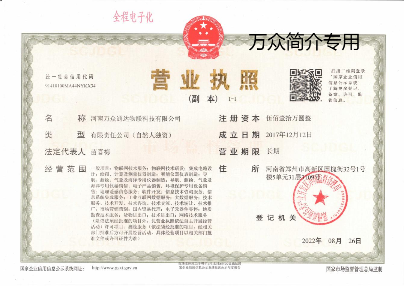 河南万众通达物联科技有限公司,成立于2017年,注册资本510万元,注册地址为河南省郑州市高新区。