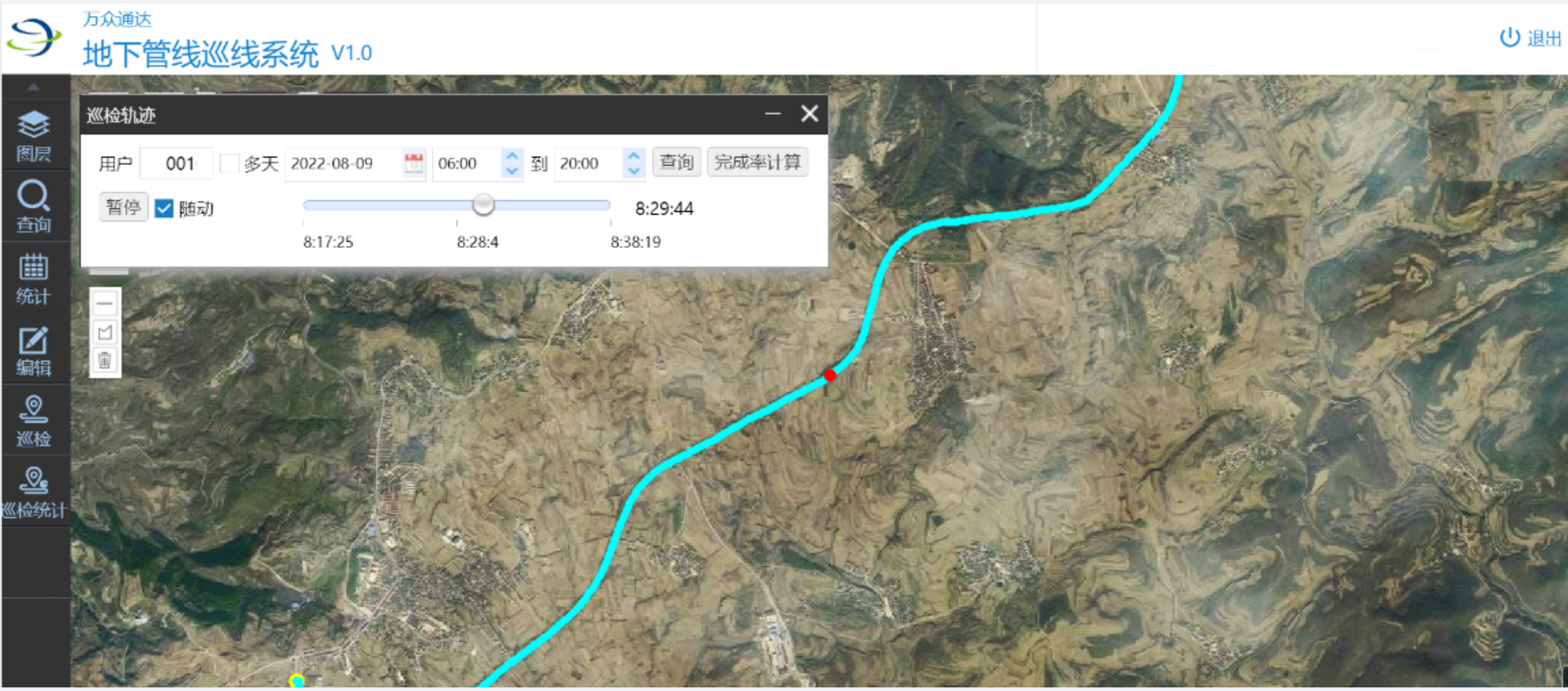 移动巡检系统:管网分布一览,车辆定位,巡检人员定位,巡检轨迹上传和回放,巡检任务划分(可以通过区域划分任务),巡检考核和统计,轨迹和任务空间比对,进行完成率计算,点检任务划分和考核,点检(设备检查),事件上报,事件处理流程管理
